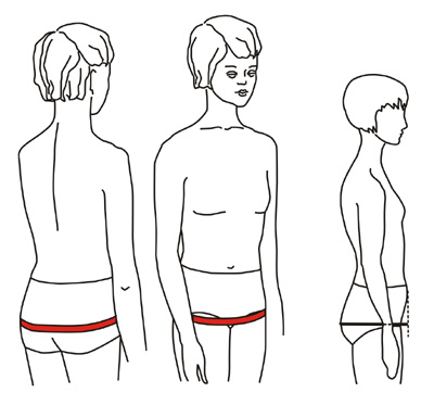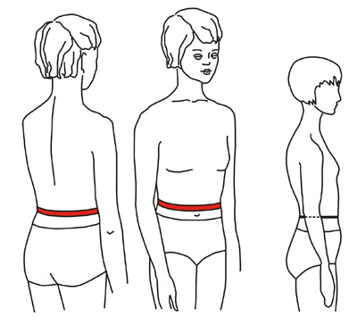 Измеряют горизонтально вокруг туловища на уровне линии талии, замыкая сантиметровую ленту спереди.