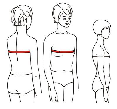 Измеряют строго горизонтально вокруг туловища, спереди через сосковые точки (наиболее выступающие точки груди).